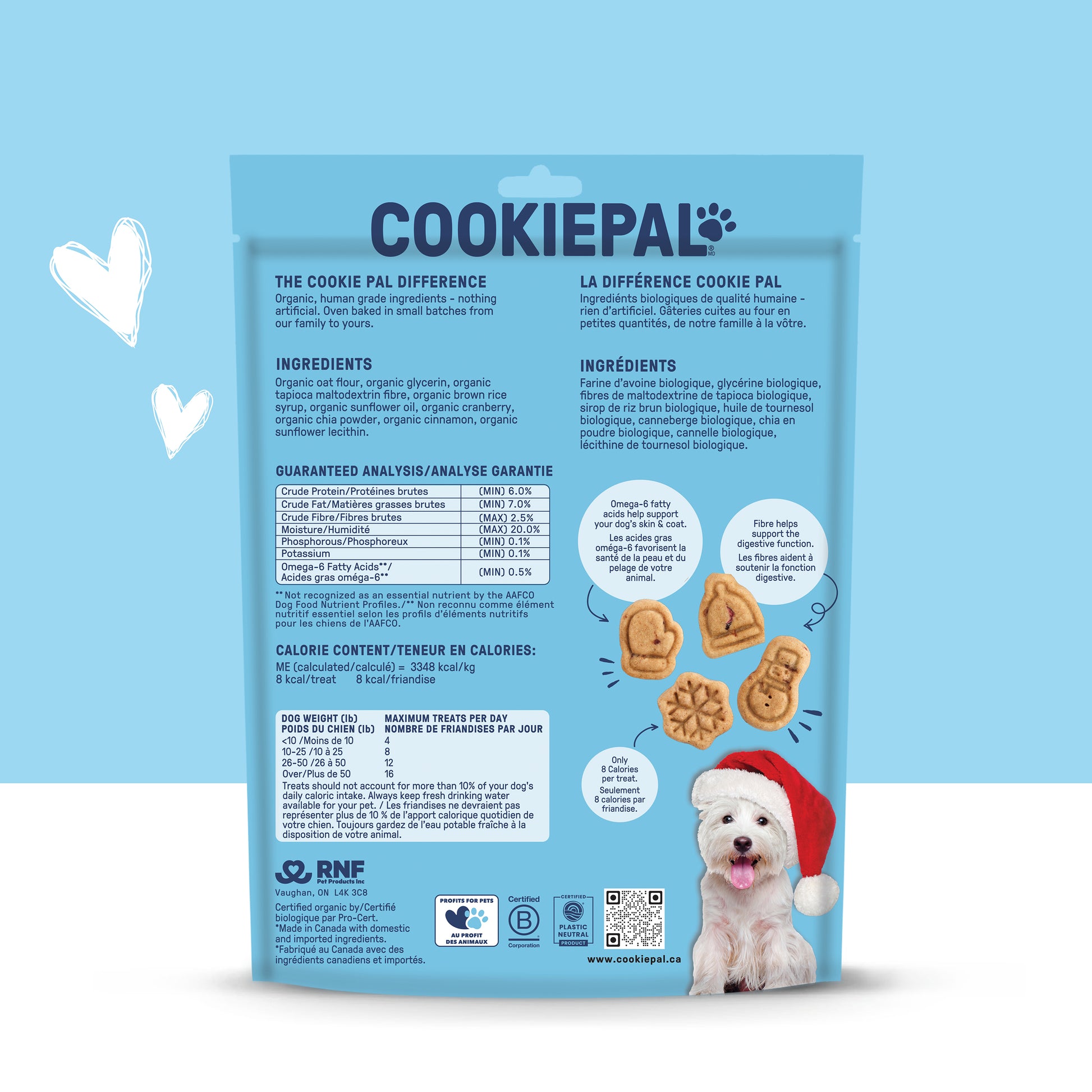 These festive, chewy goodies are made with real, wholesome ingredients and come in four adorable holiday shapes — bell, mitten, snowflake, and snowman. Each soft bite delivers cozy cranberry and cinnamon flavour, plus Omega-6 fatty acids to help keep your dog’s skin and coat healthy, fibre to support digestion, and only 8 calories per treat — perfect for guilt-free holiday snacking!