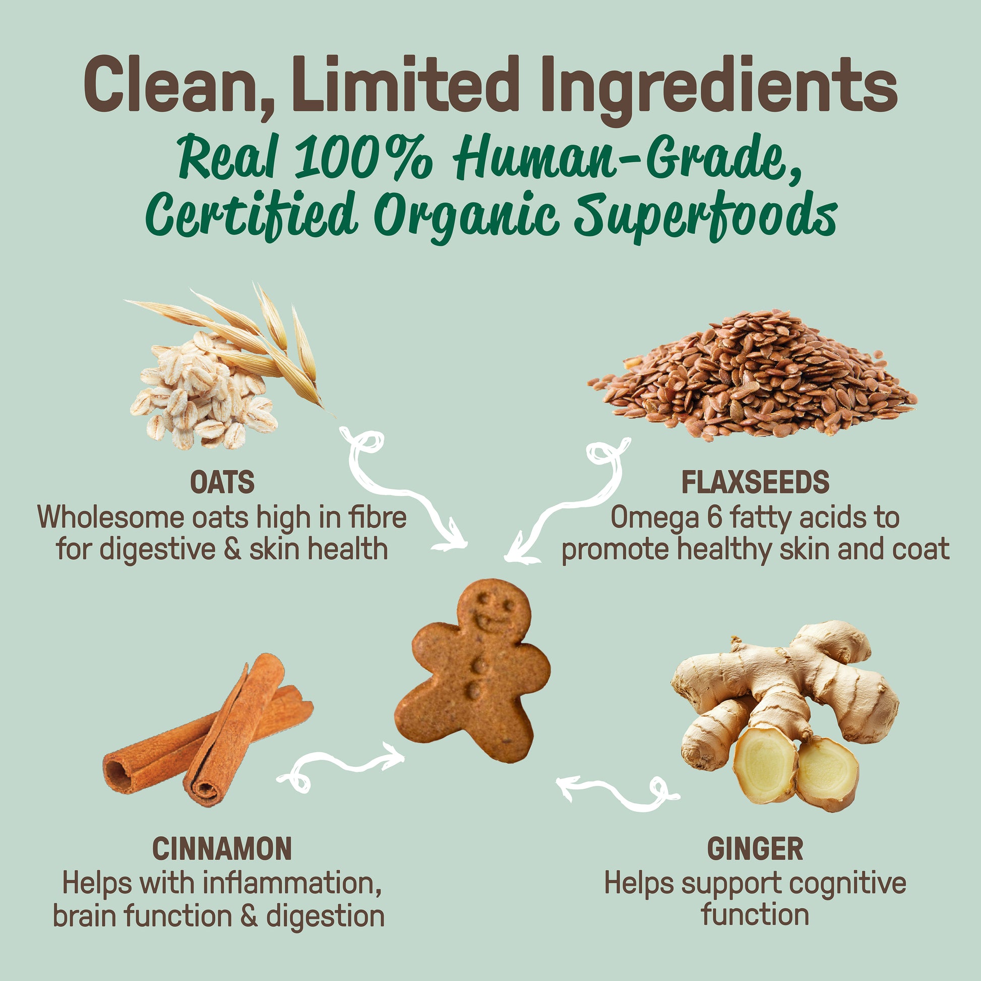 Organic oat flour, organic cane molasses, organic sunflower oil, organic ground flaxseeds, organic ginger, organic apple cider vinegar, organic cinnamon.